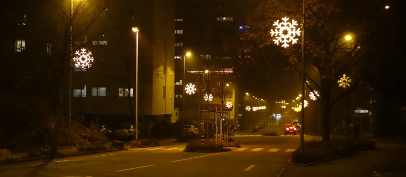 Das Bild von heute stellt die Adventsbeleuchtung in der Bahnhofstrasse von Spreitenbach dar. Links und rechts der Strasse, je eine Reihe Schneeflocken. Derweil an den Hochhäusern mit immer mehr elektrischen Komponenten in allen Farben und Sujet aufgerüstet wird.