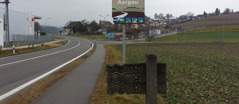 Noch wenige Kilometer dem Rhein entlang bis nach Stein hinunter. Dort nehme ich die Spitzkehre und fahre nun plötzlich in einen eisig kalten Gegenwind nach Eiken und später nach Frick hinauf. Zwischen den Hügeln lässt der Wind wieder nach. Die Wolkendecke ist auch wieder kompakter Nebel, liegt sogar auf den höchsten Hügeln auf.