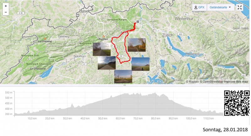 Als die Sonne um die Mittagszeit die Oberhand über den Nebel gewann, dauerte es nicht mehr lange, bis mein Rad auf der Strasse stand. Ich war früh dran. Zudem war es schon fast wieder frühlingshaft warm. Das müsste reichen für eine längere Fahrt. Für einen Granfondo, den ich mir vor längerer Zeit schon auf das GPS geladen hatte.