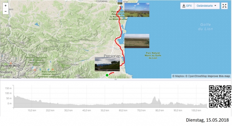 Spätestens nach Saint Cyprien, als sich die Strasse gegen Norden wendete, und nun mehr oder weniger dem Meer entlang führte, wurde aus dem Rückenwind zuerst ein Seitenwind, vielleicht noch etwas von hinten. Doch mit der Zeit drehte er sich und ich fuhr die restliche Zeit hautsächlich gegen einen Wind von vorne links.