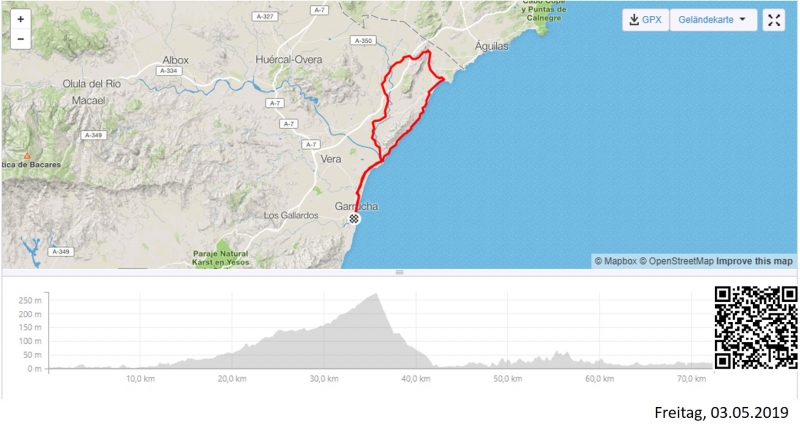 Nicht nur für mich, auch für die Gäste war es die letzte geführte Rundfahrt vor der Heimreise. Wie üblich nach der Königsetappe ein Ausrollen, durch die Ebene nach Pulpi, ein gemächlicher Anstieg auf den heutigen höchsten Punkt, danach sausen lassen bis fast vor das Restaurant mit unserem Lunch in San Juan de los Terreros. Die Sicht von einem meiner Lieblingsstrände hinaus auf das Meer genoss ich heute ganz besonders.