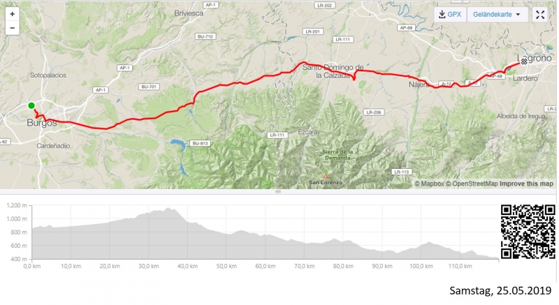 Manchmal gibt es eben doch Tage, da sollte man besser nach der Vorgabe des GPS fahren. So zum Beispiel heute. Ich folgte der N-120, manchmal N-120a, immer schön in Richtung Logrono. Auffällig beim gestrigen Kartenstudium war, dass sowohl meine Planungssoftware wie auch Google-Maps an einer bestimmten Stelle einen Riesenbogen machten, statt schön weiterhin der N-120, mehr oder weniger Nahe an der A-12 (Autobahn) zu folgen. Etwa 10 Kilometer vor Logrono war dann tatsächlich Schluss mit “meiner” N-120. Sie vereinigte sich mit der Autobahn. Übrig blieb der Jakobsweg. So kam ich heute doch noch in den “Genuss” einer holprigen, kiesigen, manchmal auch sandigen Strasse folgen zu müssen. Dafür kam ich so direkt zu meinem Hotel.