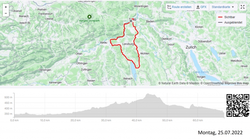 Ich fahre noch etwas dem See entlang und wende dann bei Meisterschwanden über Sarmenstorf hinauf. Eine Schussfahrt nach Villmergen ins Bünztal hinunter. In Dottikon am Bahnhof genehmige ich mir eine kurze Pause bei einem kühlen Getränk, bevor ich die letzten Kilometer das Bünztal hinunter und später über das Birrfeld nach Hause zurück lege.
