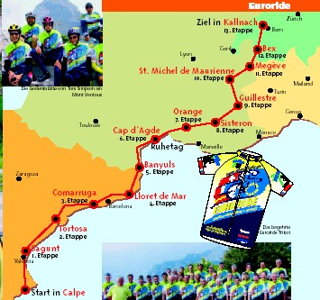 Der Veranstalter “lockt” die Gäste mit obigem Streckenbildchen zu seinem Euroride. Weitere Details über zu befahrende Pässe und KM auf einem Prospekt bei Fun for bike, und dann weiter bei Euroride und weitere Details.