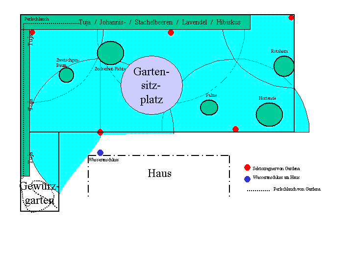Gegen Abend erfüllte ich mir noch einen alten Bubentraum: Die Installation einer Sprinkleranlage im Gärten, die auch ihren Namen verdient. Ein Schlauchende anschliessen, Wasserhahn auf und die Sache wird nass. Alles Material stammt Übrigens aus dem Sprinkleranlagen-Programm von Gardena.