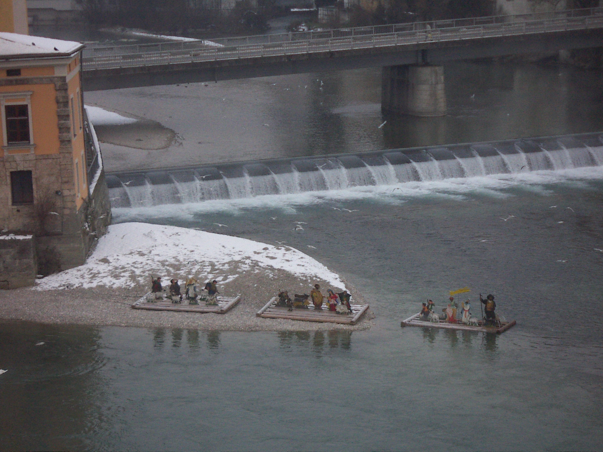 Flösser Krippe So befand sich direkt vor unserem Hotel, am Zusammenfluss der Enns (von links) und der Steyr die Flösserkrippe. Sie ist ganz offensichtlich der Berufsgattung der Flösser gewidmet und konnte so auch auf die langen Fahrten mitgenommen werden. Bei Hochwasser, beziehungsweise wenn es nicht dauernd so kalt gewesen wäre bei etwas mehr Wasser, wären alle drei Flosse in einer Reihe auf dem Wasser geschwommen.