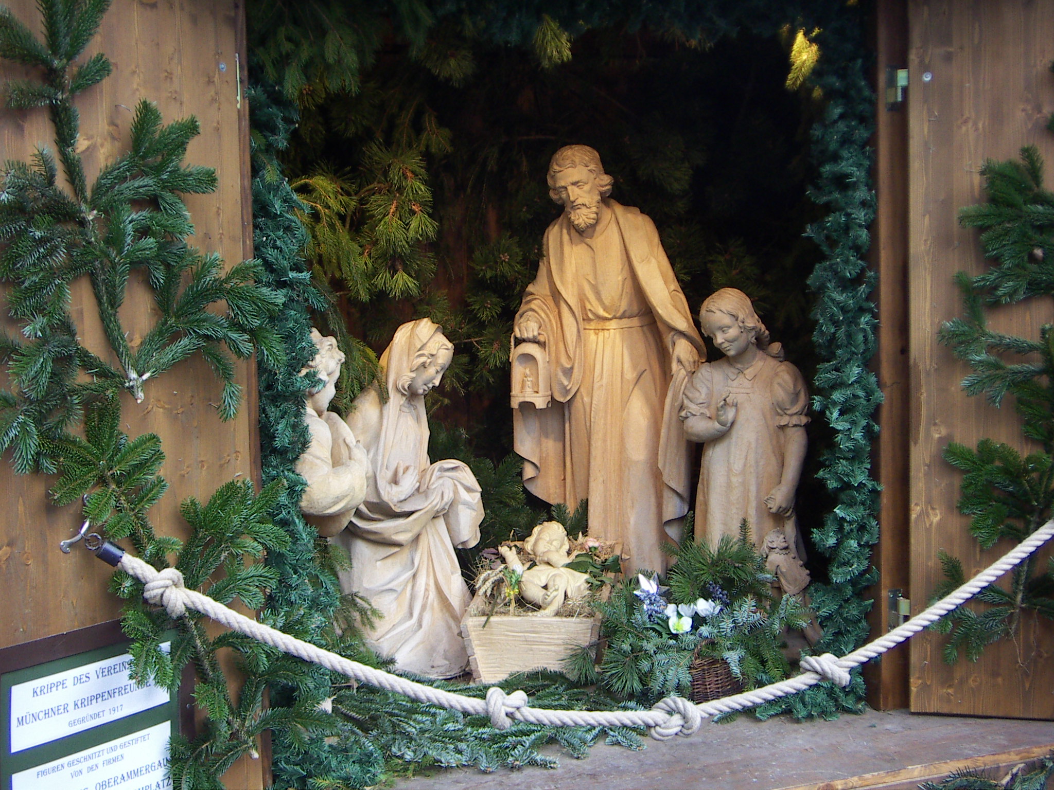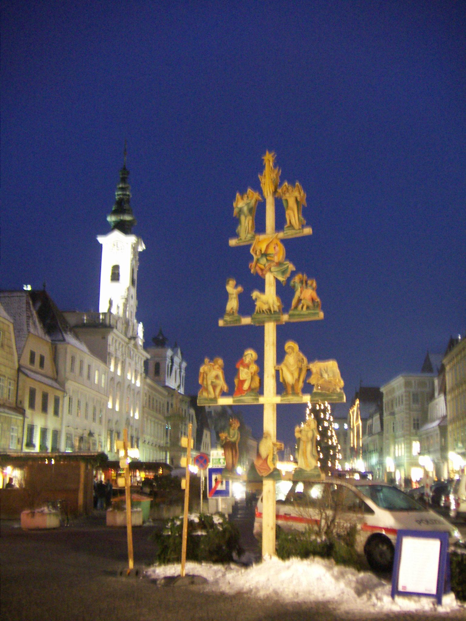 Baumkrippe in Steyr Auf den ersten Blick etwas eigenartig oder ungewohnt die Baumkrippe. Die Vermutung liegt nahe, dass da mindestens die Zimmerleute, wenn nicht sogar die Waldarbeiter Hand angelegt haben. Der Himmel erscheint so merkwürdig blau, weil ich die Aufnahme in der Nacht und ohne Blitz machen musste.