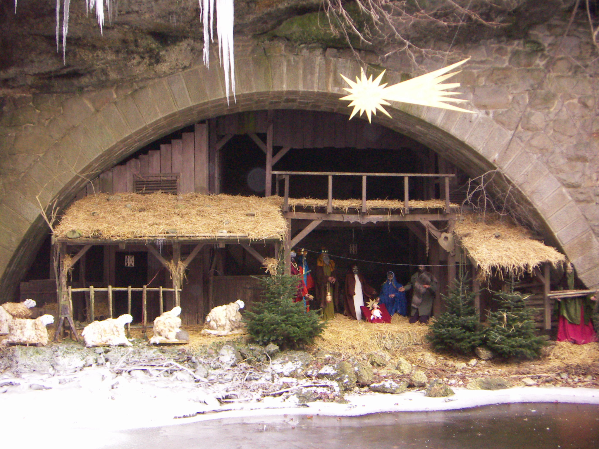 Jägerkrippe Eher zufällig haben wir die Jägerkrippe gefunden. Sie hat nichts mit der Berufsgruppe der Jäger zu tun, sondern wurde eben von einem Herrn Jäger vor Jahren gesponsert. Sie steht in einer Felshöhle an einem fast idyllisch anmutenden Weiher, allerdings eingeklemmt zwischen der Hauptverbindungsstrasse und dem Bahnhof. Über die Felswände rinnt ziemlich viel Wasser, was bei diesen Temperaturen zu einer ziemlichen Eisbildung geführt hat. Ich finde gerade diese ungewohnte Dekoration gibt der Szenerie die notwendige Andacht und Stille.