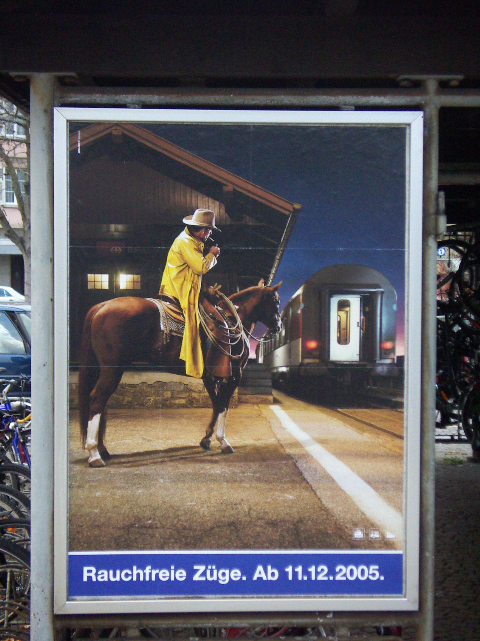 Damit ist nun plötzlich Schluss. Von einem Tag auf den anderen wird das Kamel und der Reiter auf dem Pferd mindestens vom Bahnhof, beziehungsweise vom Zug und den Verkaufsflächen der SBB verdrängt. Ein Stück Freiheit wird entfernt. Das eingehämmerte Bild von Kamel, Pferd und Reiter zerbröckelt und wird langsam zu einem Verbot, zu etwas, das man lieber sein lassen sollte, will man sich dafür nicht Ärger einhandeln. Das Kamel und der Reiter sehen den Zug künftig nur noch von hinten. Damit wir übrigens den Gedanken der Freiheit, doch plötzlich fälschlicherweise nicht auf den Zug übertragen, macht uns die SBB mit einem dezenten Spruch auf diese Sinnesänderung aufmerksam. Notabene dort, wo sonst geschrieben steht, dass das Ausnützen dieser Freiheit schädlich sein könnte.