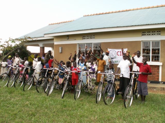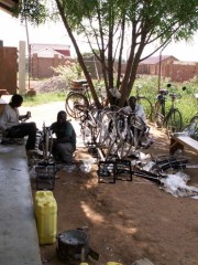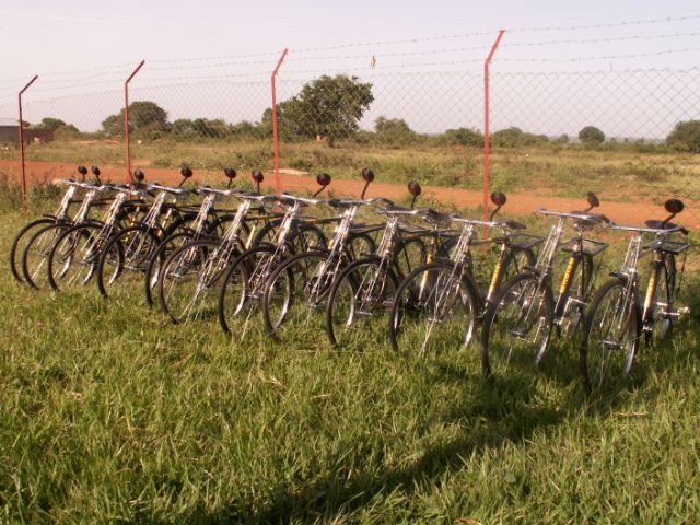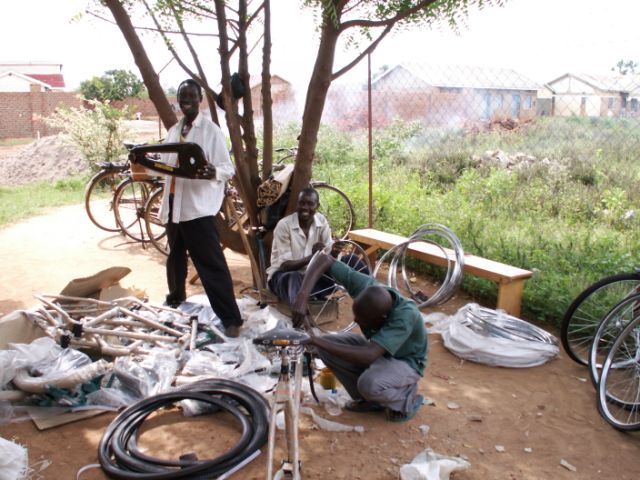 Nach dem Swiss Border Ride 2006 konnte ich insgesamt die Spenden von zwölf Fahrradpatenschaften einzahlen. Einige Vorstandsmitglieder von Swiss Hope reisten darauf hin nach Uganda und waren beim Zusammenstellen und Ausliefern der Fahrräder dabei. Ich erhielt vor einigen Tagen dazu folgende Bilder über die Veloproduktion in Uganda:
