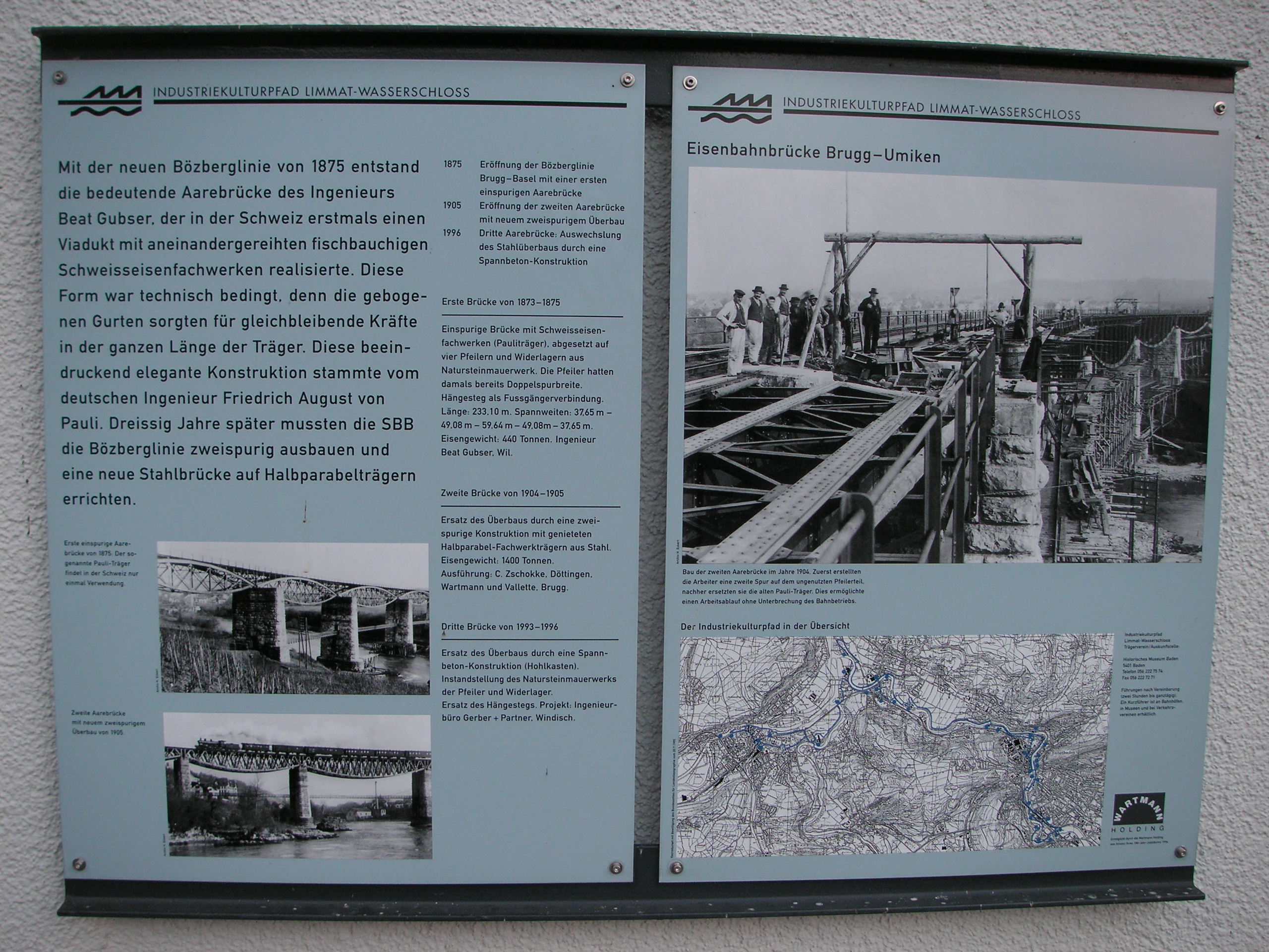 Ganz so einfach ist es zwar nicht, denn “vorher” ist auch schon bereits die zweite Version, erstellt in den Jahren 1904-05. “Nachher” wurde in den Jahren 1993-1996 erstellt. Es handelt sich um die Eisenbahnbrücke der Bözberglinie zwischen Brugg und Umiken. Bemerkenswert an dem Bauwerk dürfte sein, dass die Brückenpfeiler aus dem Jahre 1875, der Erbauung der ersten Eisenbahnbrücke stammen. Die Pfeiler wurden bereits damals für eine zweispurige Brücke ausgelegt, obwohl damals (1875) nur eine Spur aufgelegt wurde.