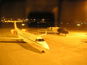 Während des Flanierens zwischen den einzelnen Food-Islands, könnte es ja vielleicht günstig sein, mal einen Blick aus dem Fenster zu werfen. Leider waren die meisten Flugzeuge der WEF-Besucher allerdings zu weit draussen abgestellt, um mit meinem kleinen Fotoapparat da noch etwas erspähen zu können.