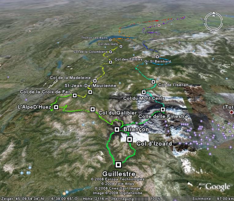 Jetzt ist es klar. Am Samstag-Morgen, 12. Juli 2008, werden ich für die Fahrt durch Savoyen aufbrechen. Sie wird mit einer ganz flachen Etappe, entlang dem Jura-Südfuss bis an den Genfersee starten. Ab Thoneaux-les-Bains wird es dann zunehmend hügeliger und die Pässe immer höher. Col de la Madeleine, Col de la Croix de fer, L’Alpe d’Huez, Briancon. Das ist ungefähr die Route, die ich mir für den Hinweg vorgenommen habe. In Briancon mache ich vielleicht einen Ruhetag und fahre dort nur den Col d’Izoard.