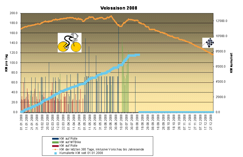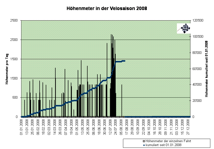 Will ich meine beiden Jahresziele von 2007 mindestens nochmals wiederholen, müsste es hier gelegentlich wieder weitergehen. Allfällig fehlende Kilometer könnte ich im kommenden Winterpokal schlimmstenfalls ja noch auf der Rolle abfräsen. Doch bei den Höhenmetern wird kein Weg an der realen Strasse oder dem wirklichen Gelände vorbeiführen.