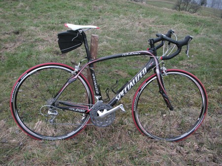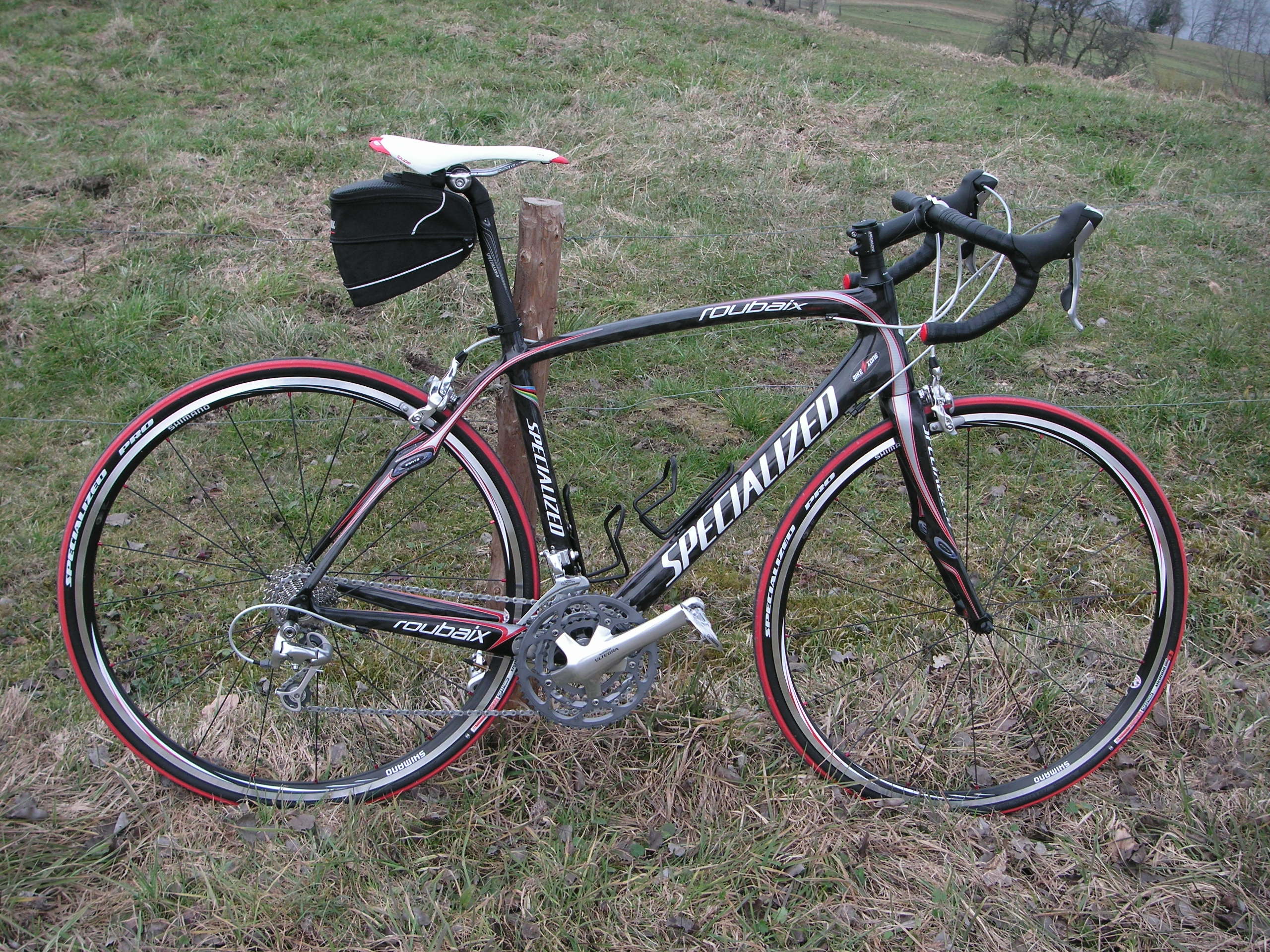 Es handelt sich um das Modell roubaix von Specialized. Im Gegensatz zum Original habe ich allerdings Ultegra-Komponenten montieren lassen. Auch das Lenkerband ist ein schwarzes, anstelle des weissen am Original. Vorne drei Kettenblätter, wie dies bei Rennern in der Zwischenzeit üblich ist. Hinten hat er 10 Zahnrädchen, auch dies scheint in der Zwischenzeit üblich zu sein. Weil der Lenker einen knappen Zentimeter mehr Durchmesser hat, als bei meinem alten Renner, passt mal vorläufig die Halterung zum Beispiel für das GPS nicht mehr drauf. Deshalb fährt dieses mal vorerst in der Satteltasche mit.