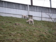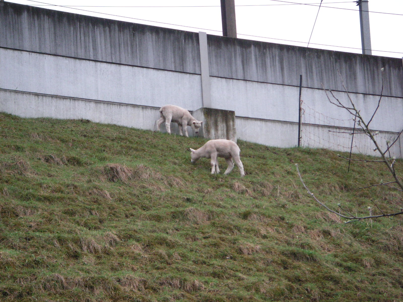 Es war nicht möglich, alle drei Schafe auf ein Gruppenfoto zu bringen. Während sich zwei am oberen Ende des Bahndammes, in der Nähe der Schallschutzwände ihre Gräser zusammensuchten, versuchte eines, ob es auf der anderen Seite des Hages, wohl ebenso gut schmecken würde.