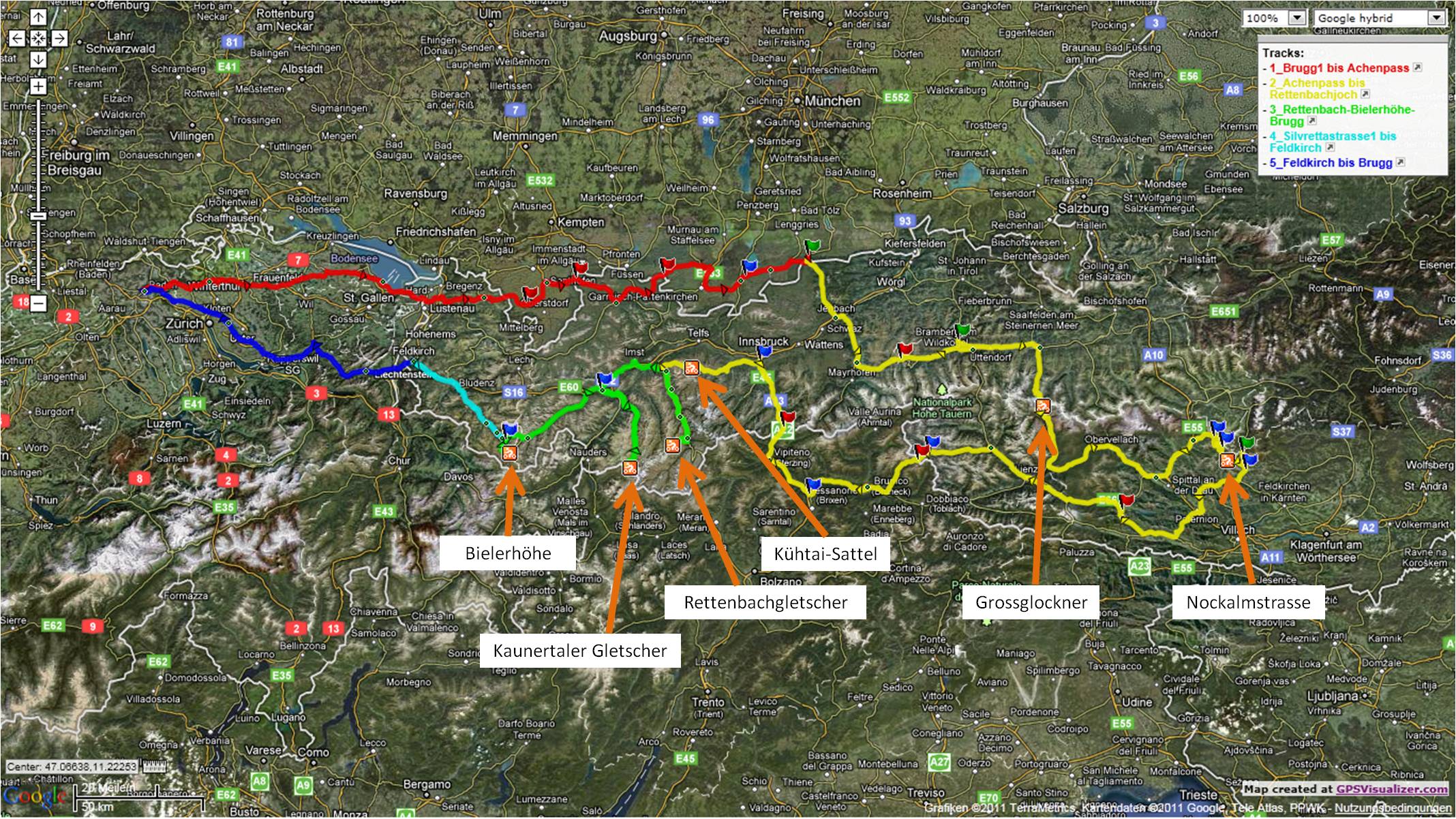 Anschliessend ist es dann Zeit, den Heimweg über die Bielerhöhe und Silvretta-Hochalpenstrasse (hellblauer und dunkelblauer Teil auf der Karte) vollends unter die Räder zu nehmen.
