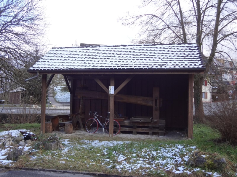 Ich wählte eine kleine Rundfahrt aus. Am Eingang ins Schenkenbergertal noch rasch ein Geocache in der Nähe einer Weintraubenpresse besucht. Noch schien die Sonne. Wäre nicht der kalte Wind gewesen, es hätten Frühlingsgefühle aufkommen können. Je weiter ich das Schenkenbergertal hinauf kam, desto schwärzer wurde der Himmel. Meinen Regenschutz hatte ich zu Hause liegen lassen, damit hatte ich nicht gerechnet. Es kam dann allerdings nicht so schlimm, wie der Himmel schwarz war. Über die Passhöhe der Staffelegg zog einfach ein Graupelschauer. Nach ein paar hundert Metern war ich da durch.