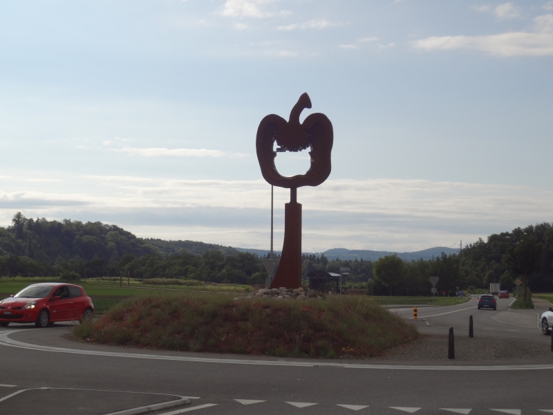 Gestern hatte ich während der Heimfahrt eingangs Birmenstorf den Säulikreisel fotographiert. Heute traf es sich so, dass ein weiterer Kilometer meines Heimweges ungefähr ausgangs Birmenstorf beendet war. Auch dort steht ein Kreisel mit einer etwas merkwürdigen, vielleicht auch kreativen Dekoration. Dieser Kreisel wurde im Januar 2012 eingeweiht. Die Dekoration besteht aus Metall. Mir kommt spontan als Vergleich eigentlich nur ein aufgeschnittener Apfel in den Sinn. Genau so, als ob jemand eine Scheibe, mitten durch das Gehäuse ausgeschnitten hätte. Ob die Dekoration vielleicht tatsächlich einen Zusammenhang mit der sich in der Nähe befindenden “Deliciel AG, dem Hersteller von Schweizer Premium Konditoreiwaren” hat, entzieht sich meiner Kenntnis.