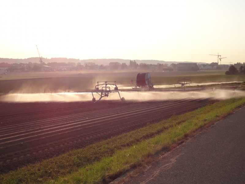 Unter diesem Eindruck, dieser rötlichen Morgenstimmung, entstand auch das Foto von der Bewässerung eines frisch bepflanzten Gemüse oder Salatbeetes im Furttal.
