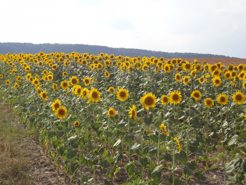 Ganz ein anderes Licht am Abend auf dem Heimweg. Die Sonne steht da noch weit am Himmel oben, die Fahrt führt aber logischerweise am Abend nach Westen, also auch wieder gegen das Licht. Das Sonnenblumenfeld ist nicht ganz das erste, das ich bereits in dieser vollen Blüte gesehen habe, aber dasjenige, welches sich so nahe an der Strasse befand und die Köpfe der Sonnenblumen alle gegen mich schauten.
