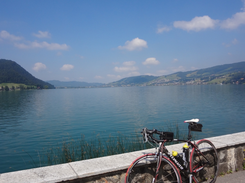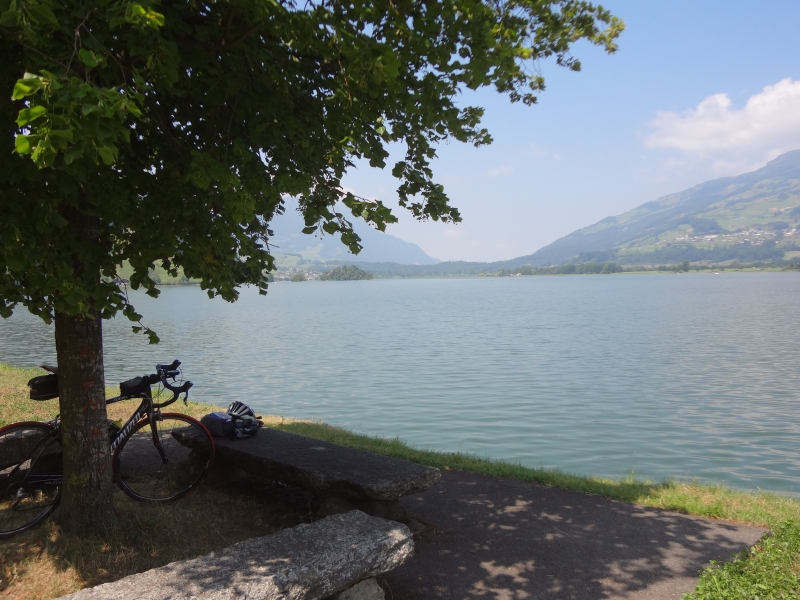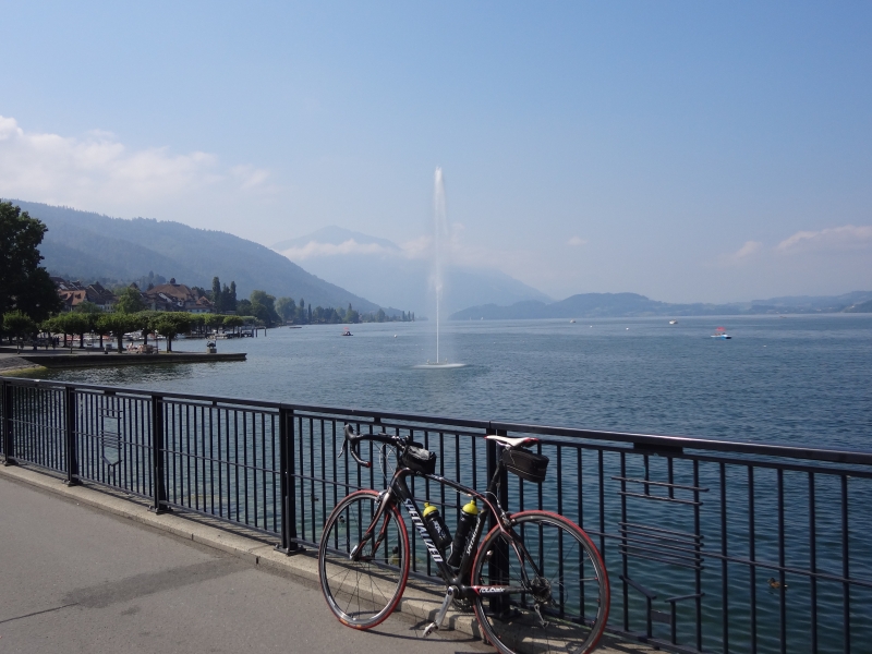 Weil die Wasservorräte nun doch langsam knapp geworden sind suche ich mir in Lauerz, vor dem Anstieg über die Bernerhöhe noch einen Brunnen. Anschliessend wieder einmal Schussfahrt hinunter an den Zugersee. Diesmal das oberste Ende. Entlang dem Zugersee hat es viele Radwege. Meine Durchfahrtszeit trifft sich gut. Die Strassen sind leer, denn die Familien geniessen den Sommertag auf den kleinen Wiesenstücken zwischen Strasse und See, wo sie heute ihre Badetücher ausgelegt haben. Sogar einzelne Grills sind aufgestellt.