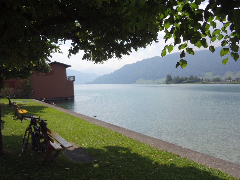 Anschliessend noch ein kleiner Übergang und weiter zum Sattel. Dann geht es in eine längere Abfahrt hinunter nach Schwyz und Seewen. Am Bahnhofkiosk in Seewen besorge ich mir heute das Mittagessen und suche mir anschliessend am Lauerzersee eine günstige und vor allem schattige, Gelegenheit für eine Pause.
