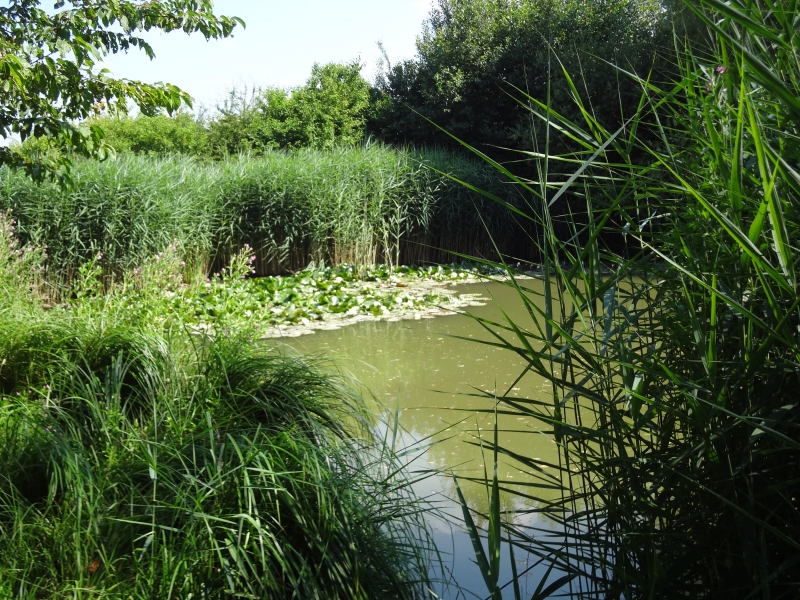 Irgendwie liess es mir doch keine Ruhe, heute noch kein Geocache gefunden zu haben. In der Nähe von Scherz befindet sich ein kleiner Weiher. Im Winter hatte ich dort schon mal erfolglos nach einem Geocache gesucht, musste aber wegen zuviel Wasser und Sumpf aufgeben. Heute war es trocken. Um den Weiher steht jetzt im Sommer meterhoch Schilf. Doch ich hatte wieder Pech. Denn dieser Weiher ist ein kleines Schmuckstück in unserer Gegend. Das haben wohl auch andere schon gemerkt und haben es sich heute hier gemütlich gemacht. Und da ich nicht gerne Geocaches unter Beobachtung suche, verdrücke ich mich nach der Aufnahme des Fotos wieder.