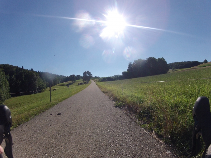 Das heutige Bildchen entstand wiederum auf dem Heimweg. Die ersten Kilometer des Heimweges sind ziemlich hügelig. Dreimal geht es hinauf, wobei der zweite Anstieg weitaus der strengste ist. Glücklicherweise unterbrochen durch zwei eher flachere Passagen geht es fast andauernd mit 10% und mehr Steigung von Birmensdorf nach Lieli hinauf. Das Foto entstand in der mittleren Rampe dieses zweiten Hügels. Oftmals musste ich fast genau gegen die Sonne fahren und diese brannte ja diesen Monat des öftern sehr heiss auf die Strasse hinunter.