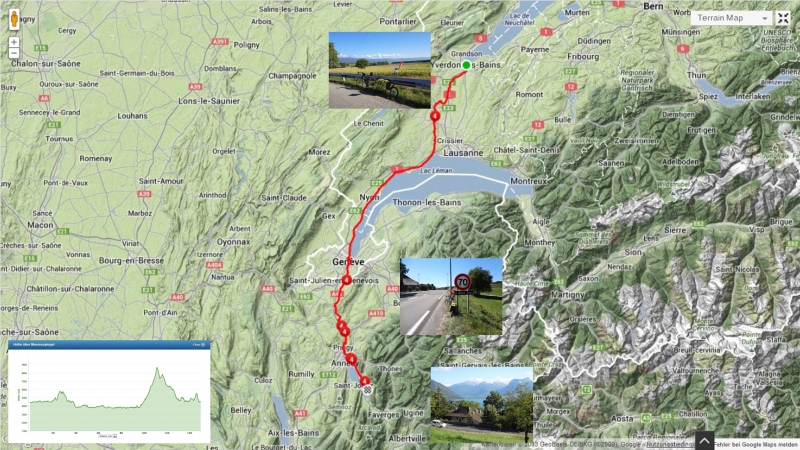 Da kann man nicht mal mehr der Navigation von Garmin einen Vorwurf machen. So ein Verkehrsgewühl wie in Genf habe ich noch selten erlebt. Baustellen, Einbahnstrassen, Umwege, gesperrte Strassen, Velowege in verkehrter Richtung durch die Einbahnstrasse usw. Irgendeinmal entschied ich mich einfach: über die Rhone muss ich kommen, und anschliessend in Richtung Annecy. Irgendwie werde ich dann meine vorgewählte Route schon wieder finden. Kurz nach dem Grenzübergang meldete jedenfalls das GPS: “Strecke gefunden”, geht also.