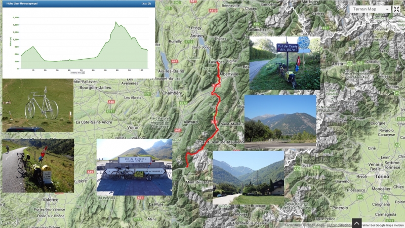 Dann der Einstieg in das Tal des Villards, mit krönendem Abschluss am Col du Glandon. Es war Mittagszeit und die Sonne stand direkt über der Strasse, praktisch kein Schatten auf der Strasse. Das Passprofil ist so, dass ich damit rechnete im unteren Teil den grössten Teil mit dem Anhänger noch fahren zu können. Selten Gefälle von mehr als 8%. Nach einer flacheren Strecke ungefähr in der Mitte, dürfte es für mich ziemlich schwierig werden die 10 bis 13% – Gefälle durchzukurbeln. So war es denn auch. Die zweite Hälfte musste ich wegen des Anhängers über grössere Teile erwandern.