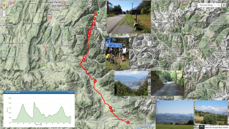 Gestern Abend bin ich ja in ein richtiges Radfahrernest gestochen. Strava schien ein grosses Thema zu sein und natürlich Routenideen auf die nächsten Pässe wie eben den Glandon, Croix de la Fer, Huez, Lautaret, Galibier, halt alles was man so kennt aus der Tour de France. Wenigstens in den Stunden bis zur Mittagszeit, traf ich denn auch auf meiner Strecke überall Radfahrer, entweder am Überholen oder im Gegenverkehr. Das Radfahrer-Mekka hier eben.