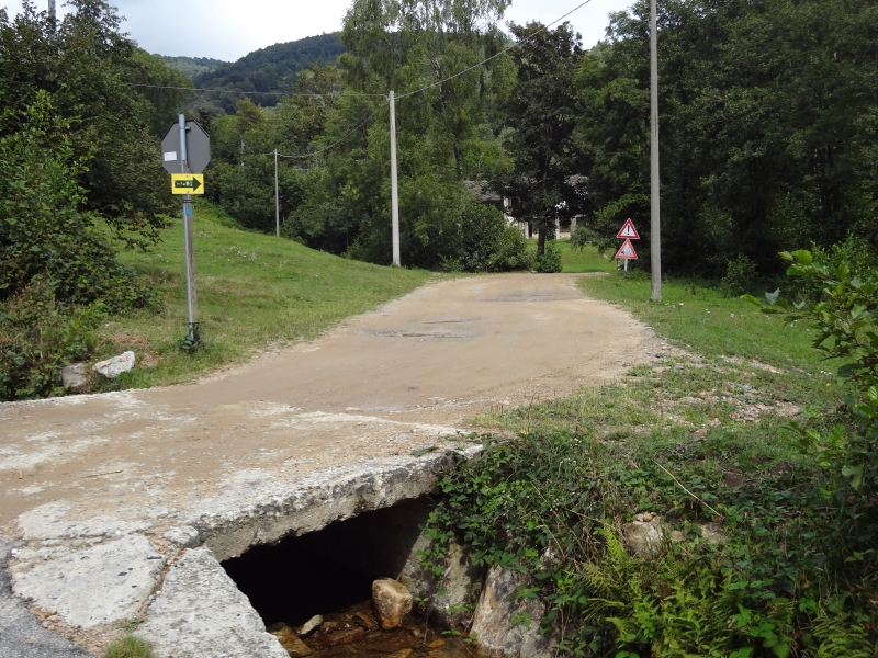 Dann kam das Stück, bei dem ich schon bei der Planung nicht recht wusste, wie es weitergehen sollte. Das GPS meldete schon die längste Zeit “Bitte wenden”, doch die Richtungstafel “Biella” überzeugte mich, dass es nicht so falsch sein kann, doch weiter zu kurbeln. Plötzlich stand ich am Ende der Strasse. Ein kleines Brückchen über einen kleinen Bach und dabei die Tafel “Graglia” dahinter ein gesandeter, gekiester Feldweg. Aus der Vorbereitung wusste ich, das Stück wird etwa 2 – 3 KM lang sein und Graglia die nächste Ortschaft.