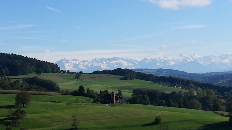 Ich wollte nicht schon ins Seetal hinunterfahren und wählte deshalb den Weg nach Zetzwil. Es war eine recht steile Rampe, die hier auf mich wartete. Doch während der Abfahrt hinunter, wieder zurück ins Wynatal wurde ich plötzlich überrascht mit einem wunderbaren Blick hinüber zum Alpenkamm. Deutlich waren die Spuren des Wintereinbruchs von letzter Woche zu sehen. Zudem muss es vermutlich etwas föhnig gewesen sein, dass die Fernsicht derart gut gewesen ist.