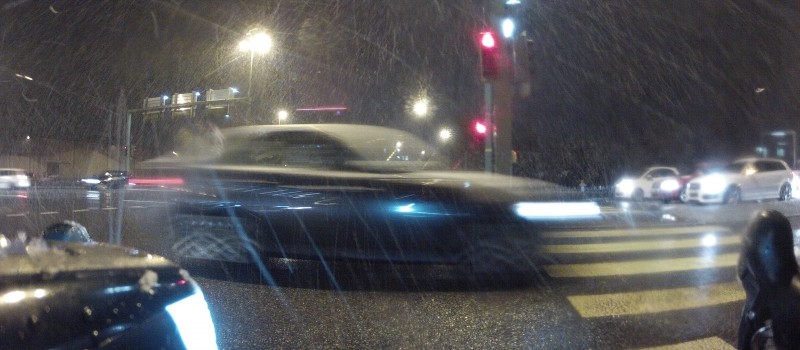 Während der Heimfahrt war es dann eher weisser Regen als tanzende Schneeflocken, die auf die Strasse fielen. Der Fahrtwind pappte damit immer wieder den Scheinwerfer zu, die Kameralinse sowieso. Auf dem Radstreifen blieb der ganze Matsch liegen, floss nicht ab. Vielleicht der Nachteil, wenn man auf der Strecke so viele Kilometer Radstreifen zur Verfügung hat. Innert kürzester Zeit, schaffte es das Regenwasser in die Schuhe.