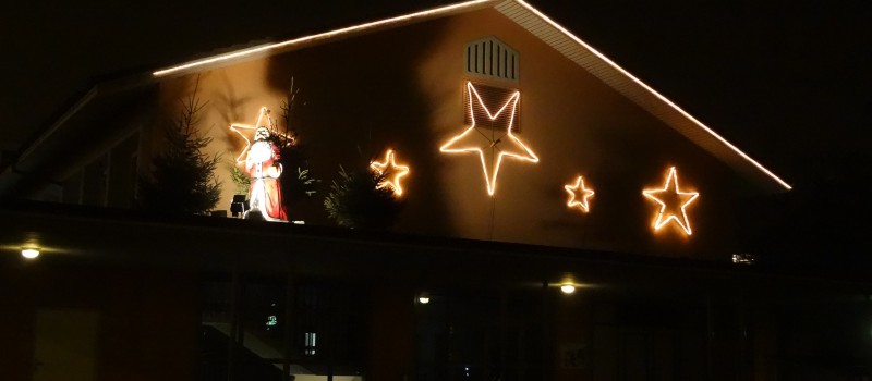 Das Adventsbild von heute habe ich in Neuenhof aufgenommen. Es ist dort auf dem Vordach des Eingangs zur Turnhalle aufgestellt und an die Wand gehängt.
