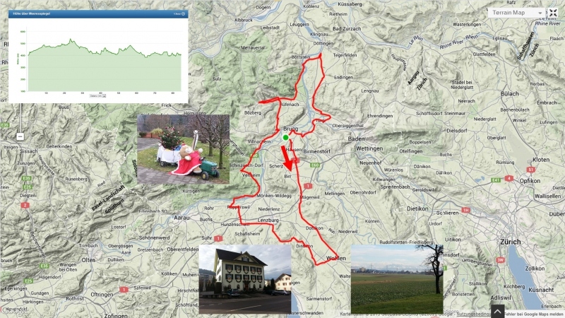 Wieder ostwärts, nochmals auf Nebenstrassen, wurde der Himmel wieder freundlicher. So dass ich mich in Umiken noch für eine Schlaufe mindestens hinter dem Bruggerberg hindurch entschied. Auch in nördlicher Richtung war das Wetter gar nicht so schlecht. So umrundete ich noch das Villigerfeld, bis hinunter an die Aare nach Döttingen.