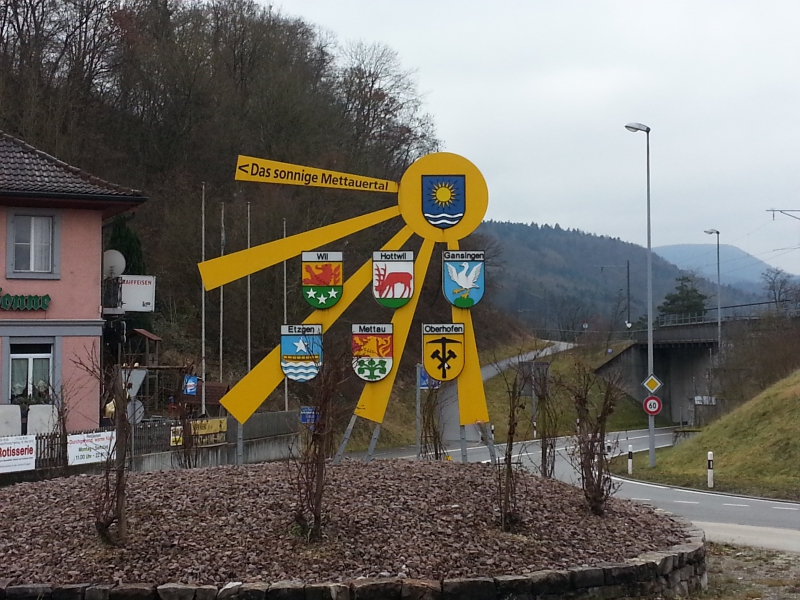 Strassenkreisel am Eingang ins MettauertalDie Fahrt entlang des Rheins erlaubt ein schönes und zügiges Rollen. Vieles sind Radwege, ab und zu auch nur Radstreifen. Ich komme gut voran, doch die Sonne macht sich weiterhin rar. Die Bewölkung mag manchmal Nebel, manchmal aber auch Wolken sein. Die Temperatur ist gerade noch so zu ertragen, wenn ich schön in Bewegung bleibe. Über die Hälfte, ist schon gefahren. Kurz vor Sisseln Mittagessen aus dem Rucksack. Die Sonne zeigt sich weiterhin nicht.