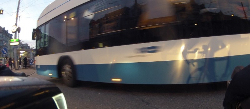 Wegen der starken Bewölkung dauerte es denn auch deutlich länger als Gestern, bis sich der Himmel erhellte und die Dämmerung den Weg für die Sonne vorbereitete. Es reichte aber dennoch, fast am Ende der Fahrt, für einen interessanten Schnappschuss. Man beachte das Spiegelbild auf dem vorbeifahrenden Linienbus.