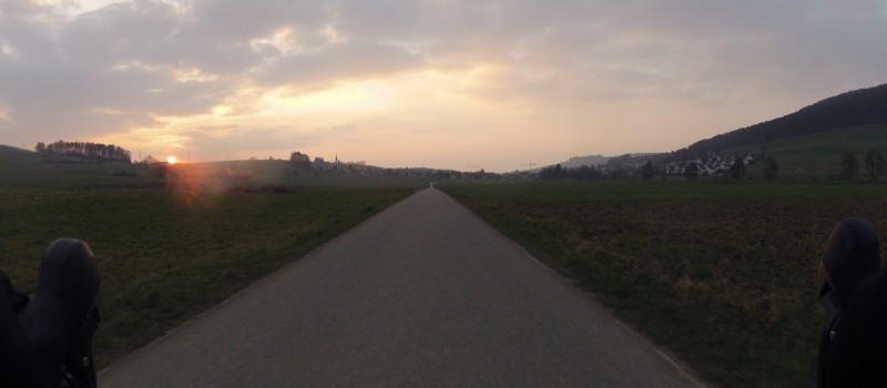 Ich war für den Heimweg ein paar Minuten früher als üblich unterwegs. An den letzten Abenden hat es ja nur noch für ein Abendrot gereicht. Doch heute sah ich die Sonne zum ersten Mal während dem Heimweg hinter dem Hügel verschwinden. Glutrot versuchte sie sich hinter einer kahlen Baumgruppe zu verstecken. Doch meiner Kamera auf dem Lenker entgeht so ein wichtiger Moment eben nicht.