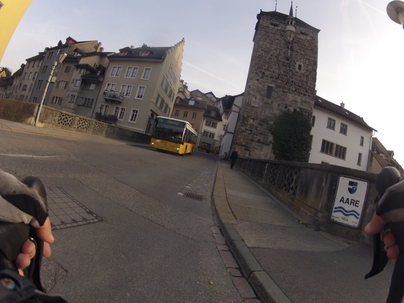 Zum Schluss der heutigen Fahrt gelang meiner Kamera schon fast ein postkartenfähiges Bild des Stadteinganges von Brugg. Tief unter der Brücke, fliesst die Aare durch eine schmale Schlucht. Gerade rechterhand das Zollplätzli. War doch dieser Übergang zur Zeit der Römer lange Zeit weit und breit der Einzige über die Aare. Auf der anderen Seite der Brücke, ebenfalls rechterhand der Schwarze Turm. Zu meiner Jugendzeit waren darin unter anderem die Polizei und das Bezirksgefängnis untergebracht. Linkerhand hinter dem Postauto, geht es in einer S-Kurve durch die schmale Hauptstrasse in die Stadt hinauf. Schon seit vielen Jahren ist dieser Teil verkehrsfrei.