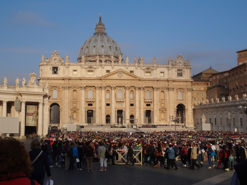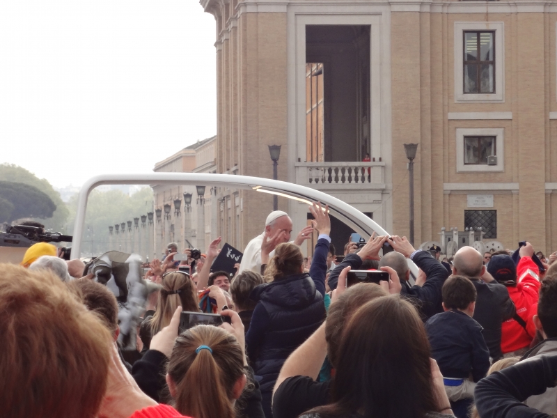 Etwa eine Stunde vor der erwarteten Ankunft des Papstes, beginnt ein Sprecher die angemeldeten Gruppen zu begrüssen. Der weitaus grösste Teil kommt aus Italien selber. Aber auch sonst sind viele Gruppierungen aus Europa und sogar Übersee heute anwesend. Plötzlich geht ein Applaus und eine Unruhe durch die wartende Menge. Auf den Bildschirmen wird der Papst in seinem Papamobil gezeigt, wie er den Platz erreicht, durch die Menge kurvt, ihm da und dort Kleinkinder zur Begrüssung hingehalten werden. Es dauert eine ganze Weile, bis er seinem Papamobil entsteigt und zum vorbereiteten Podest vor dem Petersdom steigt, von wo er sich heute mit ein paar Grussworten und Gedanken an die Anwesenden wendet. Anschliessend werden diese Worte von den Kardinälen in Französisch, Spanisch, Deutsch, Englisch und weiteren Sprachen übersetzt. Die Szene wirkt sehr eindrücklich und trotz der vielen Anwesenden Besucher, kommt mir die Andacht, die Ruhe, deutlich sinnlicher, andächtiger als gestern in der Sixtinuskappelle vor.