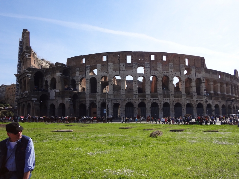 Unser Bus führt uns heute Morgen durch den dichten römischen Verkehr fast direkt vor das Colosseum. Noch sind wir fast alleine auf dem Vorplatz und können in aller Ruhe der Entstehungsgeschichte, den geschichtlichen Zusammenhängen zum Triumphbogen, den Überresten des Tempels der Venus und der Roma, geschildert von unserer Stadtführerin zuhören. Sie lässt vor unseren geistigen Augen das Ende des ersten Jahrhunderts auferstehen.