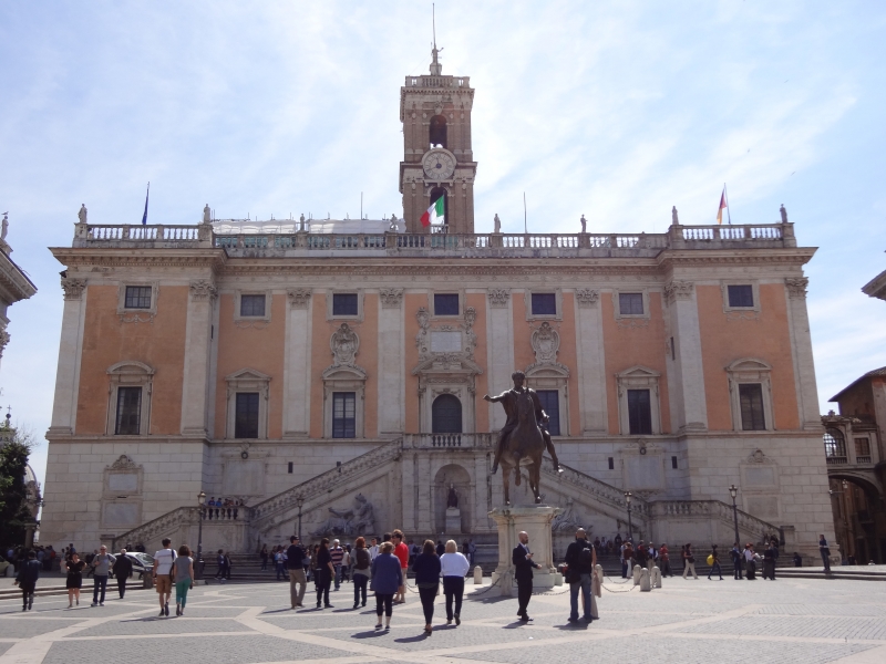 Die Stadt Rom wurde auf sieben Hügeln gebaut. Dabei soll der Capitolhügel der erste gewesen sein, von welchem aus, sich die Stadt verbreitete. Wahrscheinlich ist es deshalb auch kein Zufall, dass sich am Fusse dieses Hügels das Forum Romanum befindet. Auf der einen Seite des Hügels befindet sich eine Treppe. Die Stufen sind leicht abschüssig verlegt und übermässig lang, vielleicht einen Meter. Dennoch macht die Treppe einen steilen Eindruck. Zu römischen Zeiten sollen hier Pferde die Kutsche des Kaisers heraufgezogen haben. Vielleicht waren damals ja auch die Bedingungen bezüglich “Anlauf” holen etwas besser, als bei der heutigen Verbauung des Hügels. Dennoch: sehr verwunderlich was da die Pferde geleistet haben.