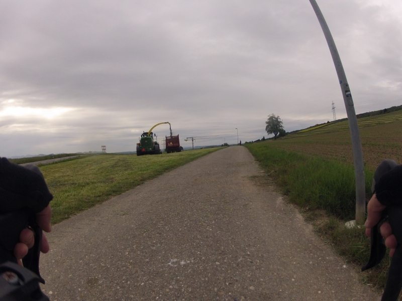 Am Abend schien sich eine eigenartige Hektik auszubreiten. Immer wieder kamen Traktoren mit geladenen Anhängern voll Heu und Gras entgegen oder überholten mich. Viel mehr als sonst üblich. Doch bei diesen Wetteraussichten, wenigstens für die nächsten 24 Stunden, wollten die natürlich alle ihr frisch geschnittenes Gras noch schnell ins Trockene, oder wenigstens ins Silo bringen.