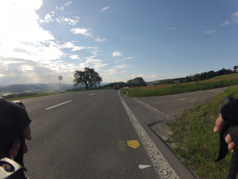 Nach einem schönen und niederschlagsfreien Tag, konnte ich heute wieder bei sommerlichen Temperaturen nach Hause fahren. Nicht wolkenloser Himmel, aber immerhin bei einer halbwegs guten Fernsicht. Im obersten Teil der langen Abfahrt vom Mutschellen nach Dättwil hinunter, konnte ich jedenfalls mehrmals meinen Blick über das Reusstal und die angrenzenden Hügel schweifen lassen.