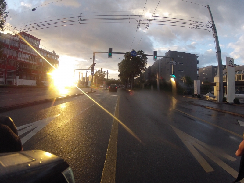 Es stimmte. Die Strassen waren kräftig nass. Von oben kam während der ganzen Fahrt kein zusätzliches Nass mehr herunter. Die Wolken lichteten sich mehr und mehr. Und plötzlich war sie da, die Sonne. Nur ein einziger Sonnenstrahl, fast genau von vorne, glänzend und von der regennassen Fahrbahn verstärkt und gespiegelt.