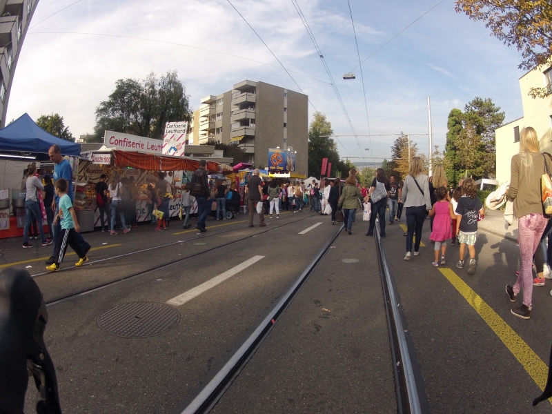 Wie es sich für das grösste Zürcher Volksfest gehört, ist die ganze Strasse beidseitig gesäumt mit Verkaufsbuden aller Art. Musik, Würste, Knoblauchbrot, Öpfelchüechli, Raclette, Kleider, brauchbares und unbrauchbares für Haus und Garten reiht sich nebeneinander auf. Auf dem grossen Parkplatz vor dem Schützenhaus der übliche Rummelplatz. Mit viel Schwung im Kreis herum, Kopfüber durch die freie Luft, Kettenflieger, Action und Lärm ohne Ende.