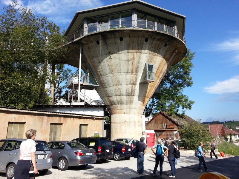 Wir trampelten mitten in die wunderbare Wohnung von Brigitte und Ueli. Genossen dort den Apero im Trockenen und kamen zu einer wunderbaren Aussicht über Herznach. Man stelle sich vor: Ein Turmrestaurant auf 18 Metern Höhe, mit freiem Blick, wenigstens nach Süden. Unverbaubare, einmalige, schönste Lage. Doch bis es soweit war, hatte der heutige Besitzer, ein ehemaliger Mühlenbauer, einen ziemlich langen Kampf mit Behörden, Banken und Lieferanten durchzustehen. Mit Phantasie, Kreativität, viel Geduld und noch viel mehr Eigenleistung baute er ein Bergwerksilo zu einem Wohngebäude mit Restaurant und Übernachtungsmöglichkeit für Gäste um. Schlichtweg ein Bijou in allen Bereichen.