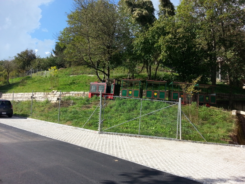 Lange Zeit bestand immer noch die Hoffnung und Absicht, den Abbau wieder aufnehmen zu können. Leider hatte das Erdbeben von Friaul (1976) auch Auswirkungen auf die Stollen im Bergwerk. Die schön aufgeräumten, “besenreinen” Stollen wurden mit einer Schicht Gestein, herabgefallen von der Decke, zugeschüttet oder fielen sogar ganz in sich zusammen. Seit dem ist man sehr vorsichtig und zurückhaltend geworden, mit dem Betreten und der Realisierung weiterer Ausbauideen in den Stollen. Alles scheint an Sicherheitsüberlegungen und damit verbundenen Kosten zu scheitern. Nur wenige Meter nach dem Betreten des Stollens, versperrt eine massive Betonmauer die weiteren Eingänge. Was übrig blieb ist ein sehr sehenswertes, kleines Museum, eine restaurierte Grubenbahn und das Bergwerksilo. Hätte es zum Zeitpunkt unseres Aperos, nach der Besichtigung des Stollens, nicht geregnet, wir hätten ihn wohl am Ufer des Badeseeleins in freier Natur einnehmen können und dabei den Damhirschen am Berghang zusehen können. Doch so führte uns die Grubenbahn direkt an den oberen Rand des ehemaligen Erzsilos und “kippte” uns dort aus.